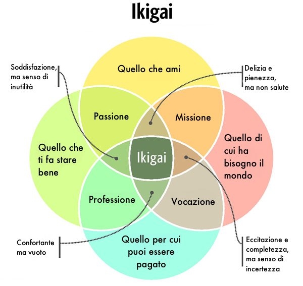 In poche parole l'IKIGAI rappresenta un metodo pratico per capire qual è lo scopo della propria "impresa". E' l'intersezione di 4 elementi: